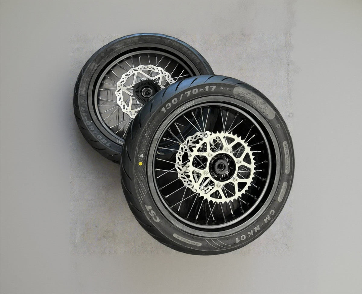 Street‑ready 17" supermoto wheel and slick tire kit for the Surron Ultra Bee, designed as a direct bolt‑on upgrade for sharper handling, lower stance, and maximum pavement grip.